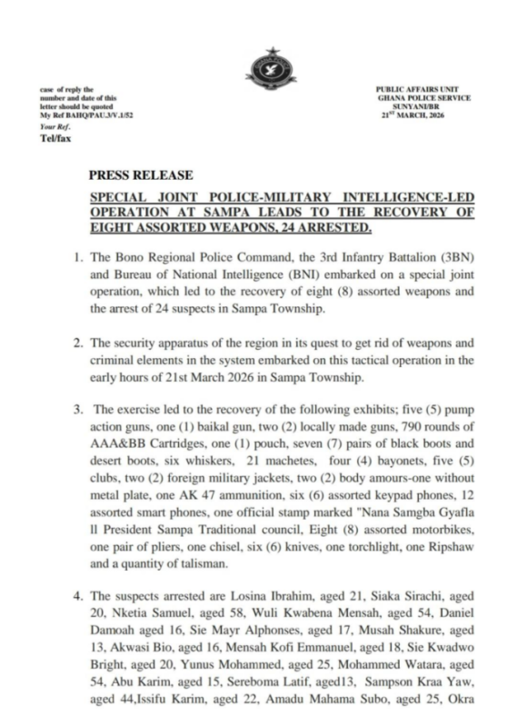 A coordinated security operation involving the Bono Regional Police Command, the 3rd Infantry Battalion (3BN), and the Bureau of National Intelligence (BNI) has led to the arrest of 24 suspects and the recovery of a cache of weapons and related items in Sampa Township.