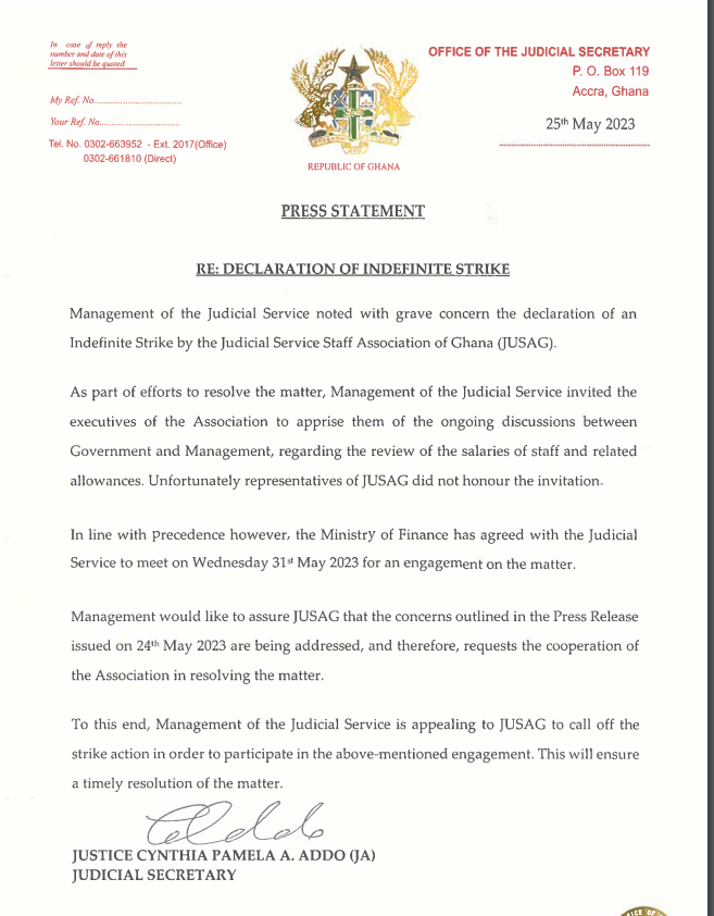 In a press release dated Thursday, May 25, the Service noted that they have taken steps hoping to address JUSAG’s issues of salaries and allowances with their executives, government and the Judicial Service management.