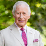King's Foundation King Charles, in a suit and tie, meeting an Indigenous leader wearing a blue cloak made from feathers, at an event in Highgrove in July 2025