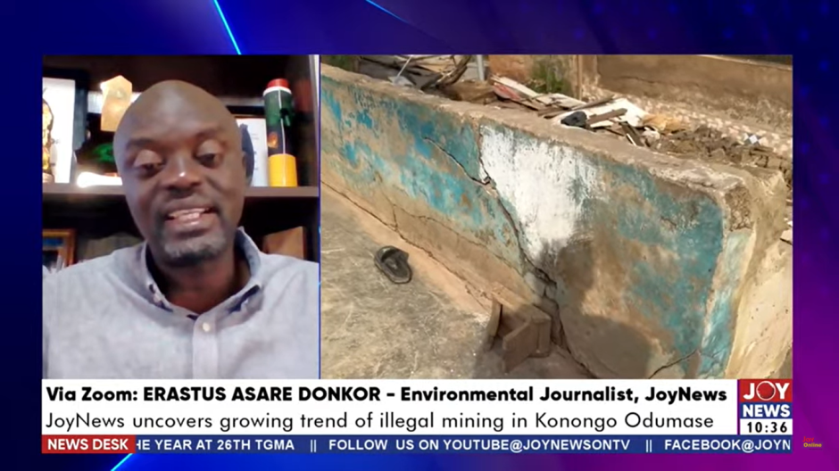 Speaking on JoyNews’ News Desk on Monday, 12 May, Mr Donkor described the town as “a crime scene”, citing blatant violations of Ghana’s Minerals and Mining Act, which prohibits mining activities within human settlements and within 100 metres of public roads.