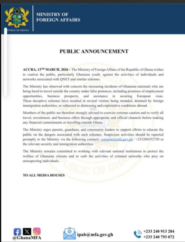 “The Ministry remains committed to working with relevant national institutions to protect the welfare of Ghanaian citizens and to curb the activities of criminal networks who prey on unsuspecting individuals,” the announcement stated.