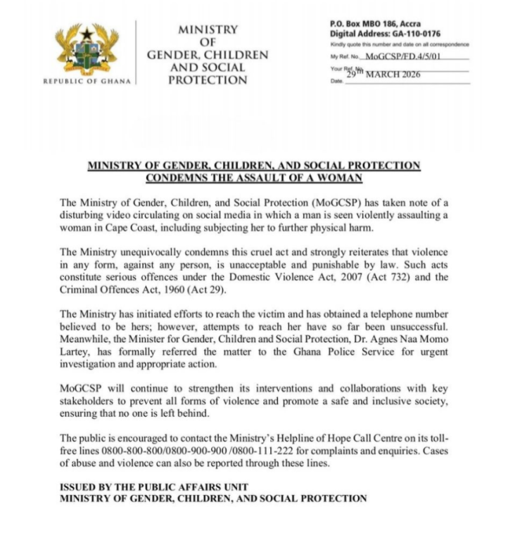 The Ministry of Gender, Children, and Social Protection (MoGCSP) has condemned a disturbing video circulating on social media showing a man violently assaulting a woman in Cape Coast, reportedly subjecting her to further physical harm.