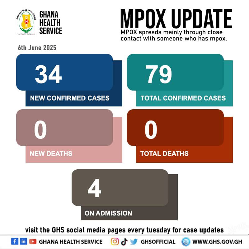 So far, 79 mpox cases have been confirmed in Ghana, with four on admission. No deaths have been recorded.