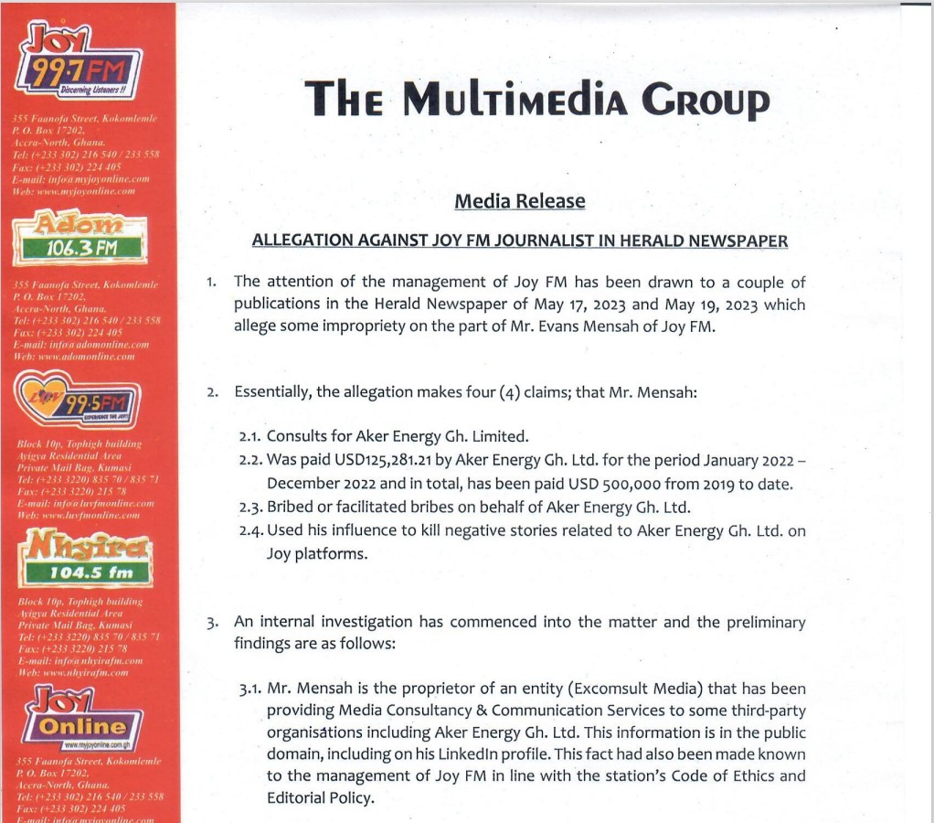 In response to a publication by The Herald newspaper which contained the allegation, MGL said its preliminary probe of the allegation shows that while Evans Mensah’s company, Excomsult Media provides consultancy services for Aker Energy, which relationship is known to Multimedia Group, he could not have influenced what is published on MGL platforms.
