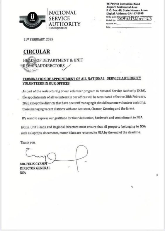 The National Service Authority (NSA) has announced the termination of all volunteer appointments, effective February 28, 2025, as part of an ongoing restructuring programme.