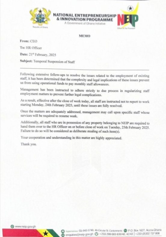 The management of the National Entrepreneurship and Innovation Programme (NEIP) has directed all staff not to report to work starting Monday, February 24, 2025.