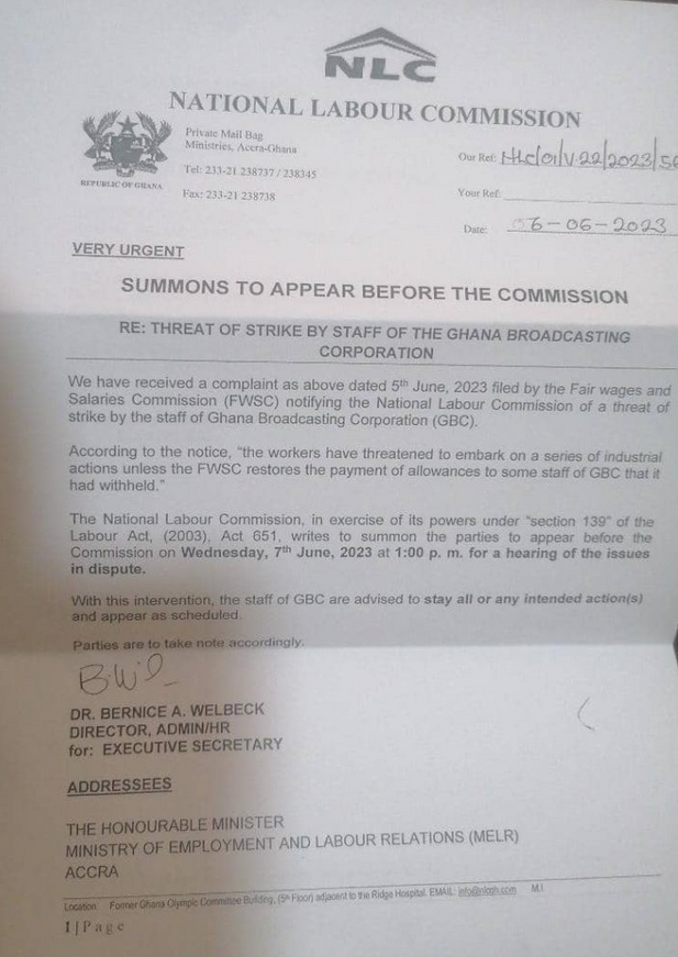 The National Labour Commission (NLC) has issued a summons to staff members of the Ghana Broadcasting Corporation (GBC).