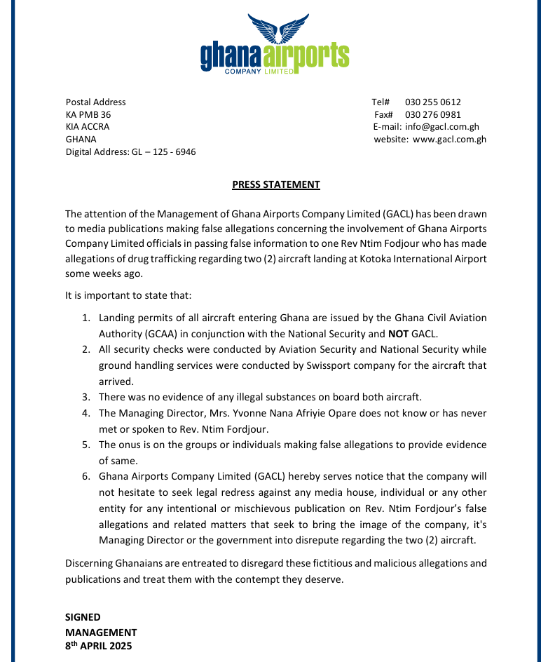 The Ghana Airports Company Limited (GACL) has refuted allegations that two aircraft, which landed at Kotoka International Airport in March, were involved in drug trafficking.