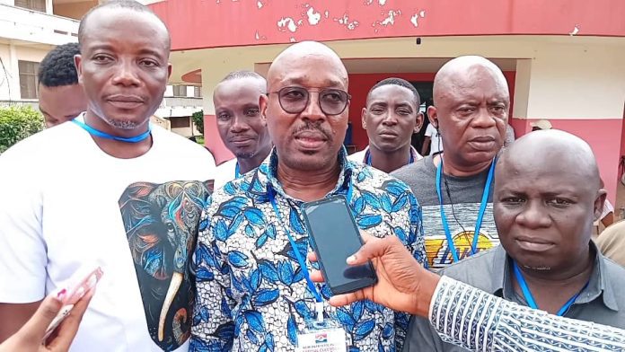 Regional Chairman of the NPP, Hon. Makafui Kofi Woanyah (in spectacles) addressing the media after the declaration of the results.