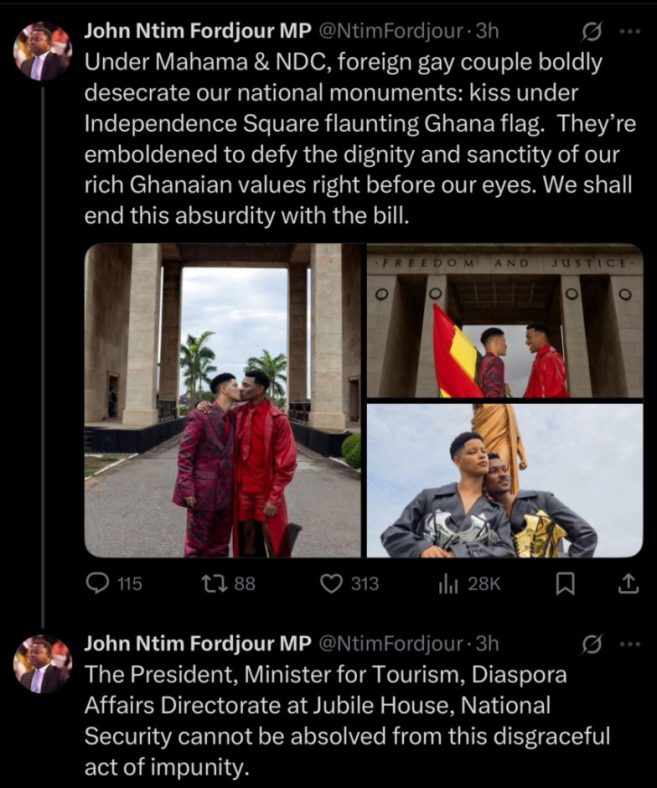 “Under Mahama & NDC, foreign gay couple boldly desecrate our national monuments: kiss under Independence Square flaunting Ghana flag,” he wrote.