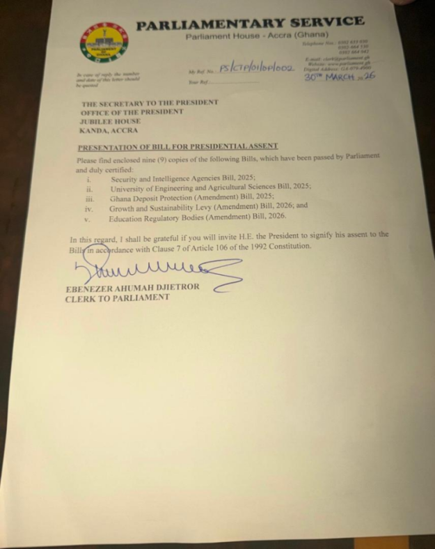 In a letter dated 30th March 2026 and addressed to the Secretary to the President at Jubilee House, the Clerk to Parliament, Ebenezer Ahumah Djietror, confirmed the submission of nine certified copies of each of the Bills, which have already been passed by the House.
