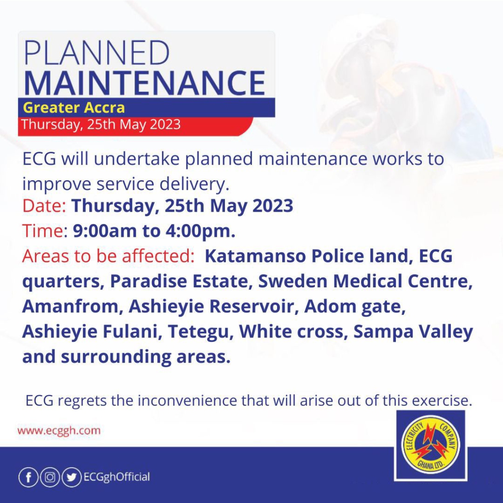 The Electricity Company of Ghana in a press statement Wednesday announced that it is undertaking planned maintenance on Thursday which will affect power flow to some areas.
