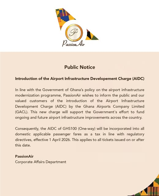 In a move aligned with the Government of Ghana’s airport infrastructure modernisation programme, PassionAir has announced the introduction of the Airport Infrastructure Development Charge (AIDC).