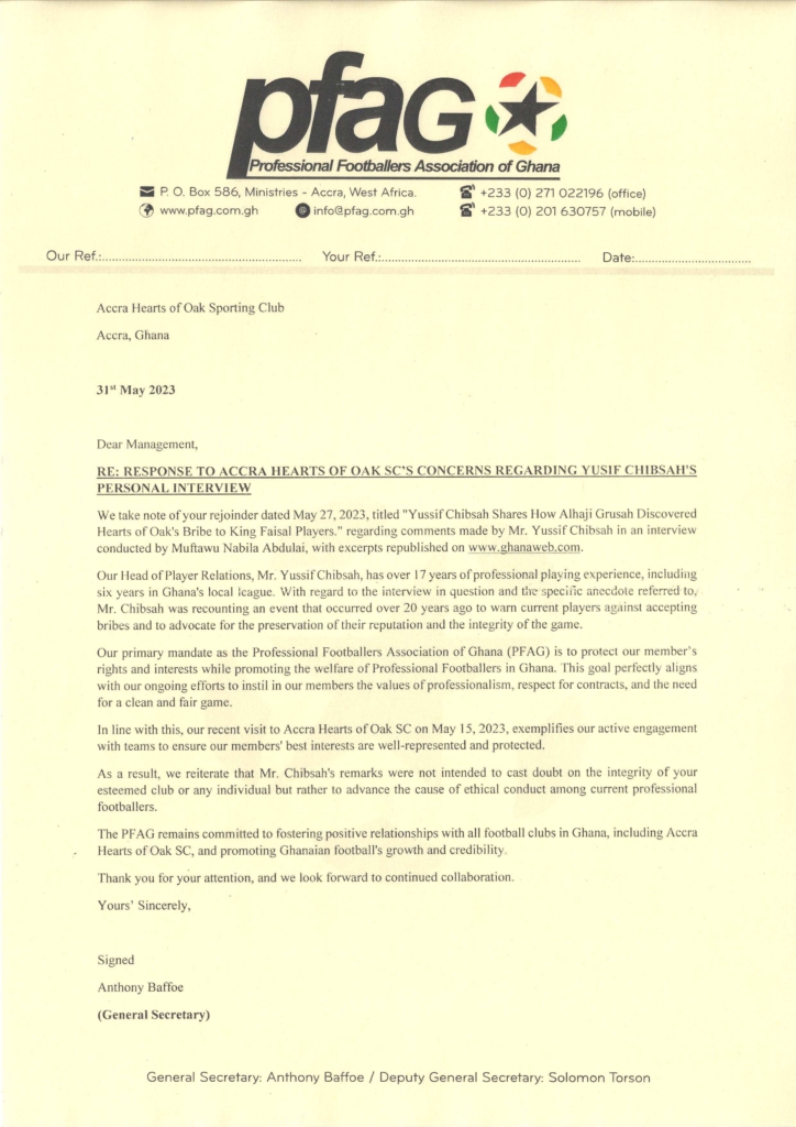 The Professional Footballers Association of Ghana (PFAG) has sought to clarify Yussif Chibsah’s comments regarding King Faisal players taking taking bribes to lose to Hearts of Oak.