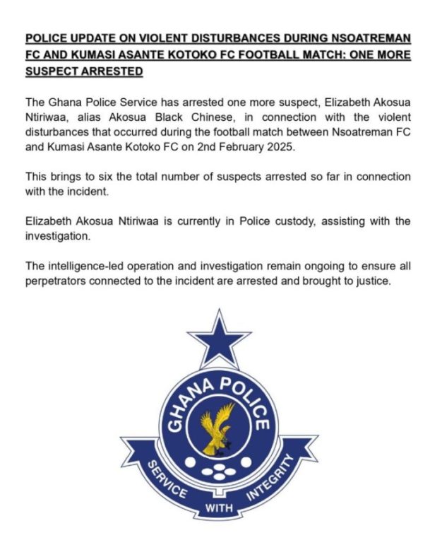The Ghana Police Service has arrested one more suspect in connection with the violent disturbances that erupted during the Ghana Premier League match between Nsoatreman FC and Asante Kotoko FC on February 2, 2025, at Nsoatre in the Bono Region.