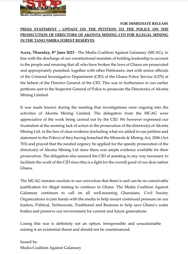 In a press release on Friday, the coalition indicated that the investigation by the Criminal Investigative Department (CID) follows their earlier petitions and evidence sent to the IGP calling for the prosecution of the Director(s) of Akonta Mining Limited.