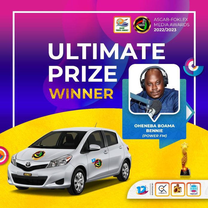 Broadcast journalist with Accra-based Power FM, Oheneba Boamah Bennie has received a brand new Toyota saloon car for getting the highest number of public votes among all the nominees in the various categories at the 2023 edition of Foklex Media Awards.