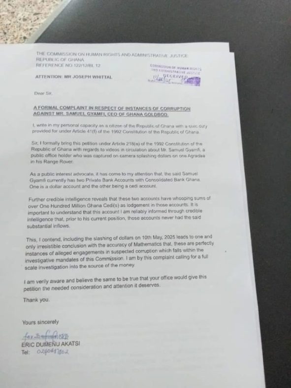 A private citizen, Eric Dumenu Akatsi, has formally petitioned the Commission on Human Rights and Administrative Justice (CHRAJ) over what he describes as a suspicious display of wealth by Mr Samuel Gyamfi, the Chief Executive Officer (CEO) of the Goldbod.