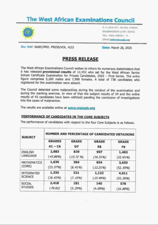 The West African Examinations Council (WAEC) has announced the release of the provisional results for the 12,452 candidates who sat for the West African Senior School Certificate Examination (WASSCE) for Private Candidates, 2025 First Series.