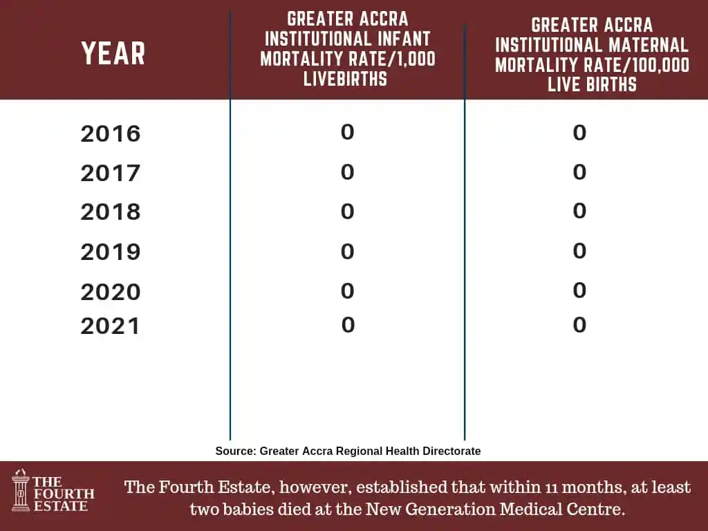 In February 2022, The Fourth Estate wrote to the Ablekuma North Municipal Health Directorate requesting data on maternal and infant mortality at the New Generation Medical Centre, Sakaman, from 2019 to 2021.