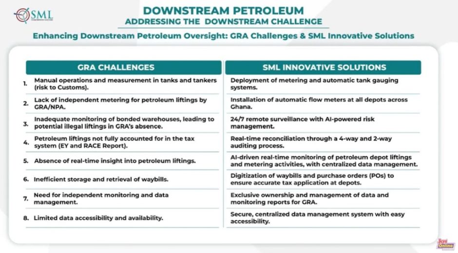 SML, a Ghanaian-owned company engaged by the Ghana Revenue Authority (GRA), specialises in revenue assurance, real-time monitoring, and audit services in the petroleum downstream sector.