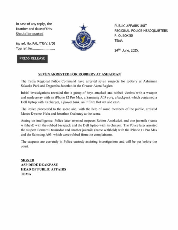 The Tema Regional Police Command has apprehended seven individuals for their alleged involvement in a series of robberies at Ashaiman Sakasaka Park and Dagomba Junction in the Greater Accra Region.