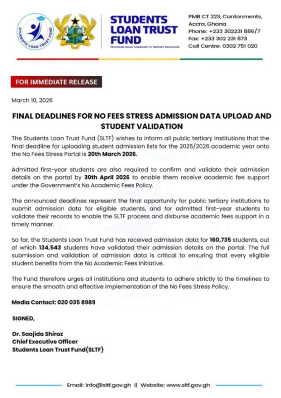 In a statement issued on Tuesday, March 10, and signed by the Chief Executive Officer of the SLTF, Dr Saajida Shiraz, the Fund said it “wishes to inform all public tertiary institutions that the final deadline for uploading student admission lists for the 2025/2026 academic year onto the No Fees Stress Portal is 20th March 2026.”