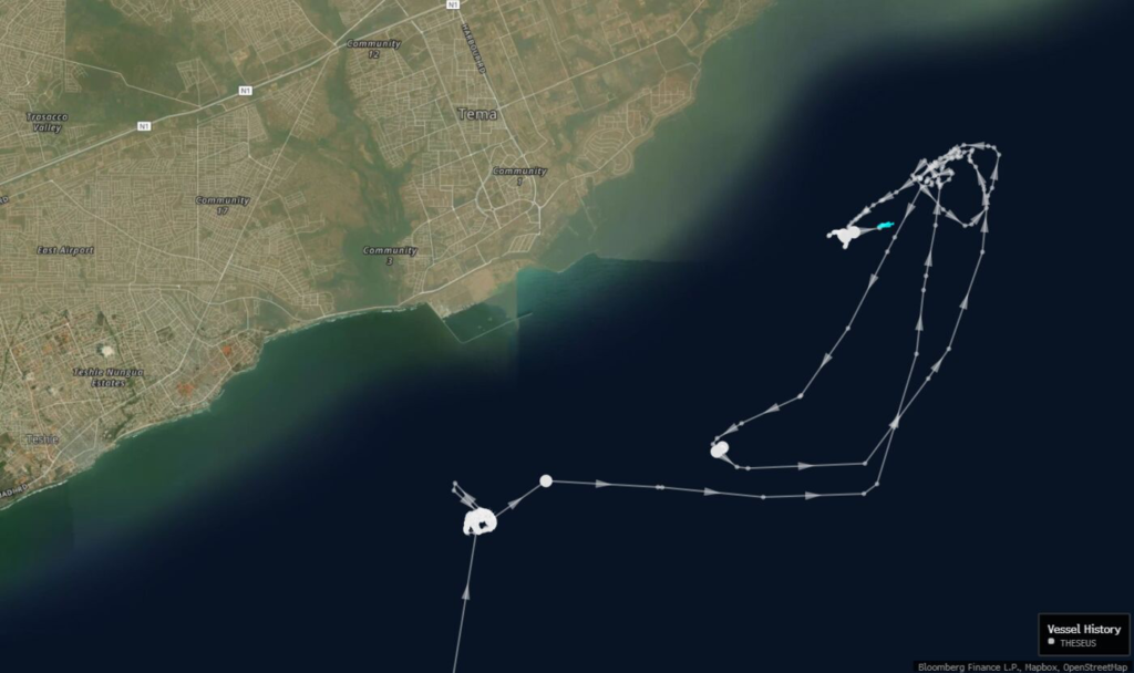 The tanker Theseus offloaded its cargo of Russian crude into storage tanks at Ghana’s Tema oil refinery over the weekend, after being anchored full off the port since Feb. 24 as it awaited permission to dock.