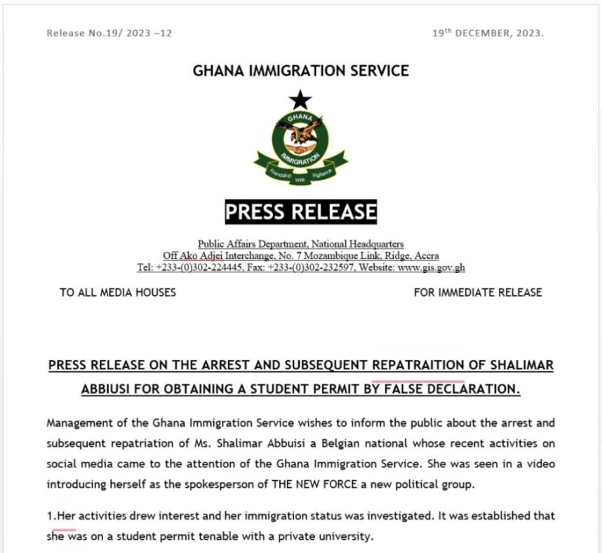 The Ghana Immigration Service has explained why it arrested and later repatriated Ms. Shalimar Abbuisi, a Belgian national and spokesperson of The New Force, a new political group in Ghana.