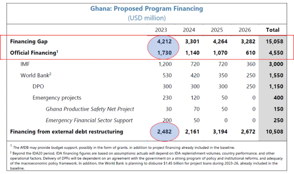 The IMF estimates that Ghana faces a total financing gap of US$15.06 billion between 2023-26. Of this, US$4.5 billion (30%) is expected to be received through official financing from the IMF and World Bank. Another US$10.51 billion (70%) is expected as financing from savings gained from restructuring its external debt arrangements.