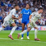 Even after Carvajal’s red card, Real continued to create chances and were rewarded for their efforts when visiting defender Facundo Medina handled following a strong challenge to stop Vinicius Jr in the box.