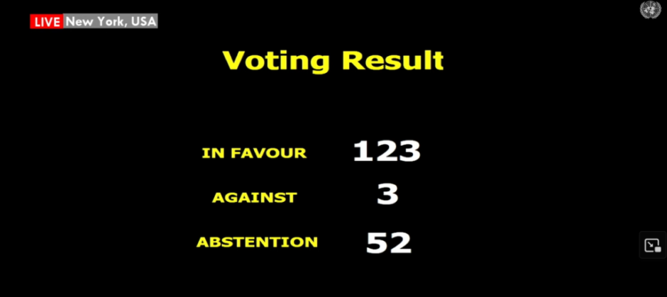 The resolution passed with 123 member states voting in favour, 3 against, and 53 abstentions.
