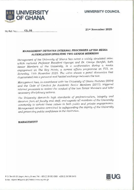 The institution said the development triggered formal steps in line with its governing regulations. Management has, in accordance with the University of Ghana Statutes (2024) and the Code of Conduct for Academic Senior Members (2011), triggered internal processes to review the conduct of the two Senior Members and take necessary disciplinary actions, the statement noted.