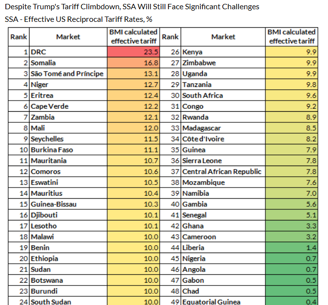 According to the UK-based firm’s Effective US Reciprocal Tariff Rates, DR Congo will be the hardest hit in Sub Saharan Africa and will be followed by Somalia (2nd), Sao Tome and Principe (3rd), Niger (4th) and Eritrea (5th).