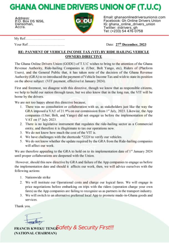 The Ghana Online Drivers Union (GODU) is threatening a nationwide strike should stakeholders fail to engage leadership on the introduction of the Vehicle Income Tax (VIT) for ride-hailing drivers.