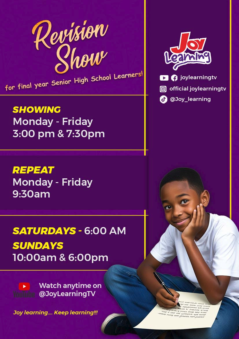If you’ve been missing our lessons on TV, no worries at all. You can now catch our live revision classes every Monday to Friday at 3:00pm and again at 7:30pm on Joy Learning TV, with a repeat the next morning at 9:30am. And we’re not leaving you stranded on weekends either tune in at 6:00 am on Saturdays, and 10:00am and 2:30pm on Sundays for extra lessons and reinforcement.