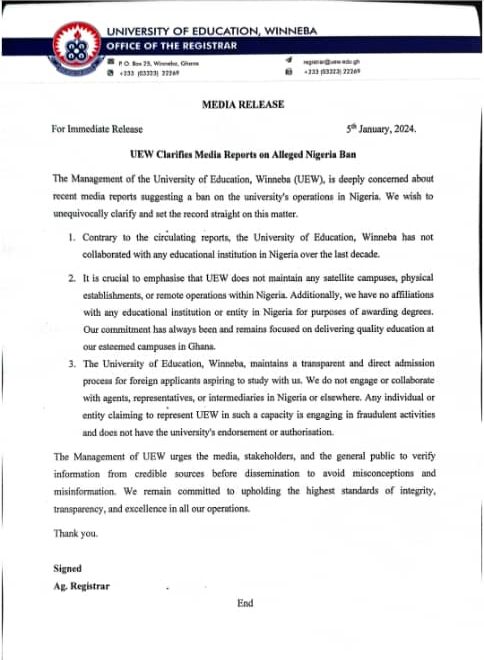 In response, UEW released a statement on Friday, January 5, categorically denying the claims and emphasising its commitment to delivering quality education exclusively at its campuses in Ghana.