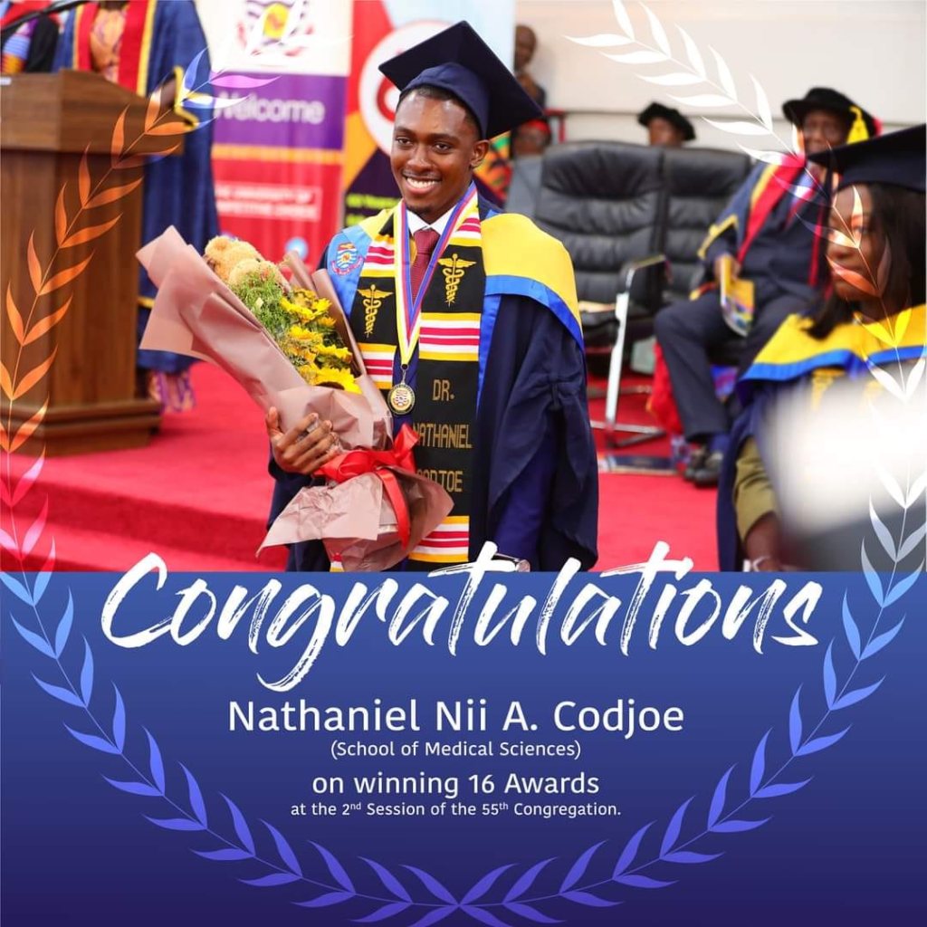 A freshly graduated medical doctor from the University of Cape Coast, Nathaniel Nii Cudjoe, held the audience at the congregation spellbound when he took the Best Student in Anatomy award, and for 15 consecutive times, his name was mentioned to pick other awards.